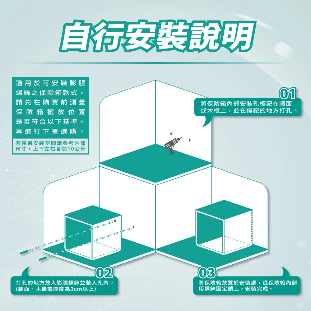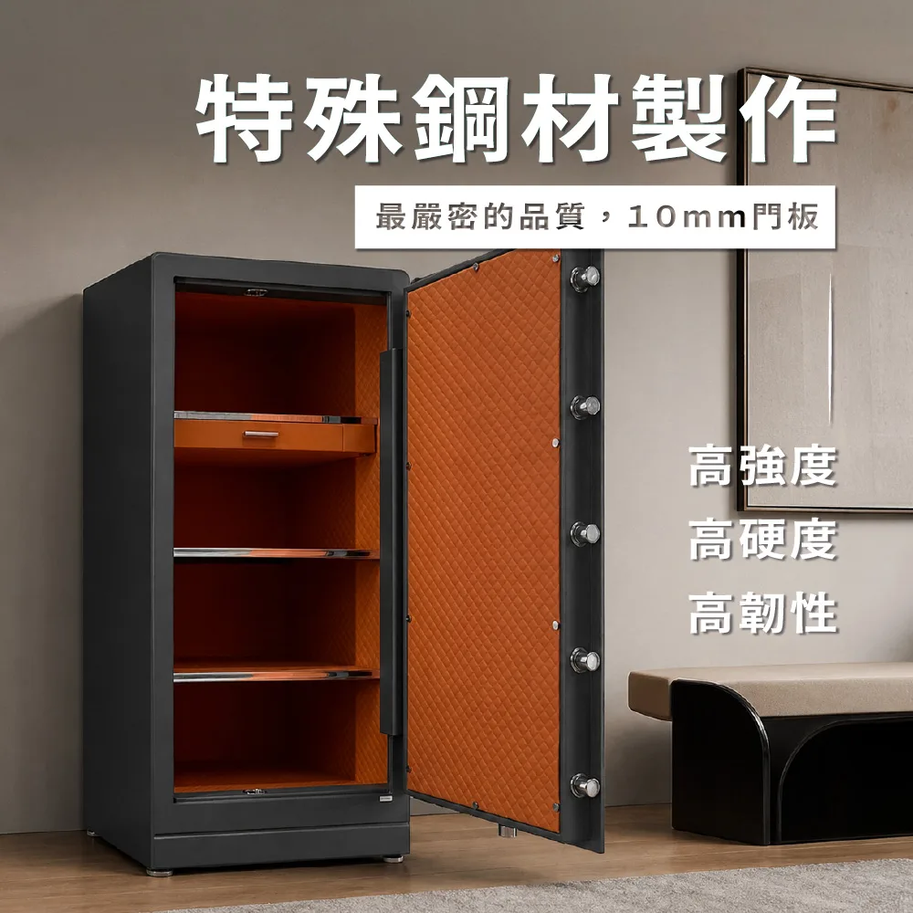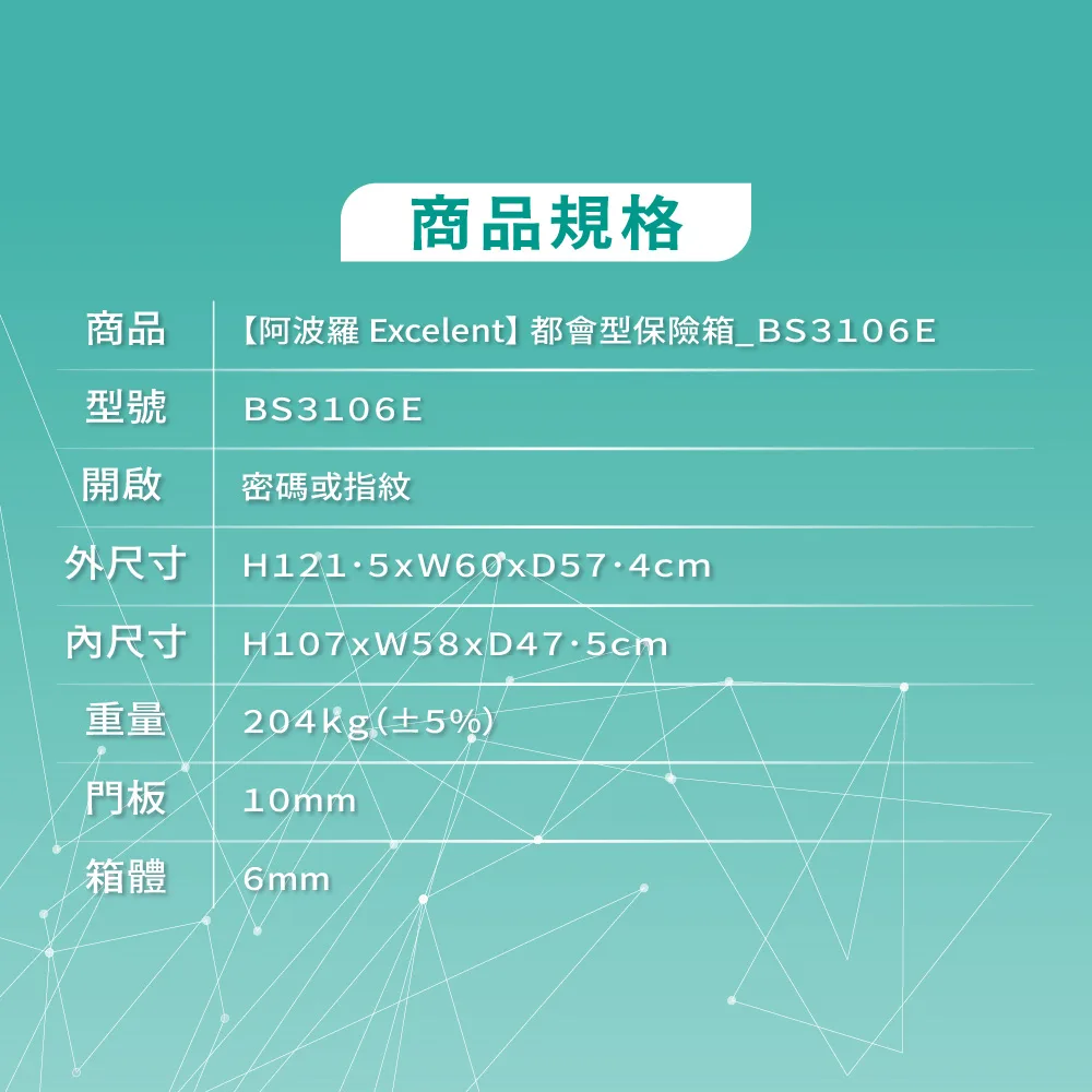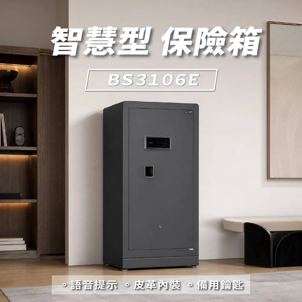 產品型號:BS3106E 顏色:鐵灰 外部尺寸:H121.5xW60xD57.4cm 內部尺寸:H107xW58xD47.5cm 門板厚度:10mm 箱體厚度:6mm 重量:204kg(±5%) 開啟方式:密碼或指紋