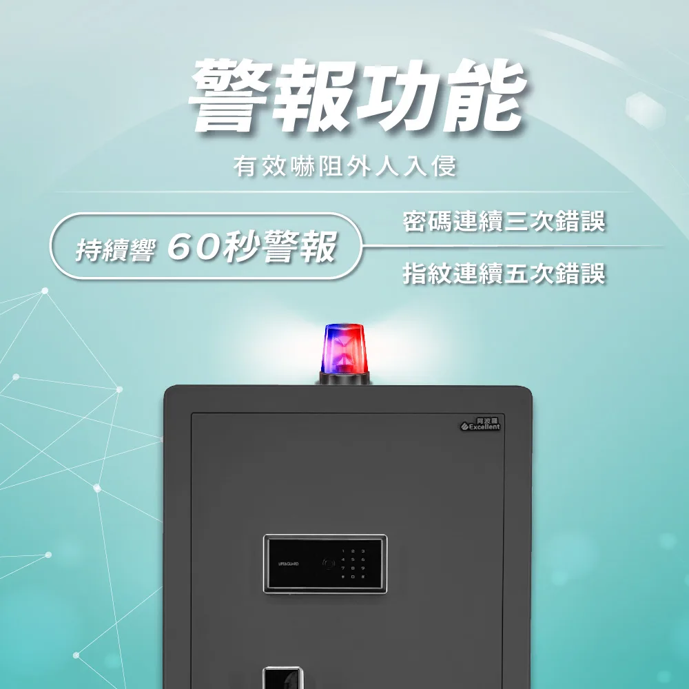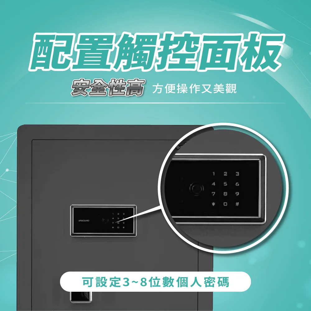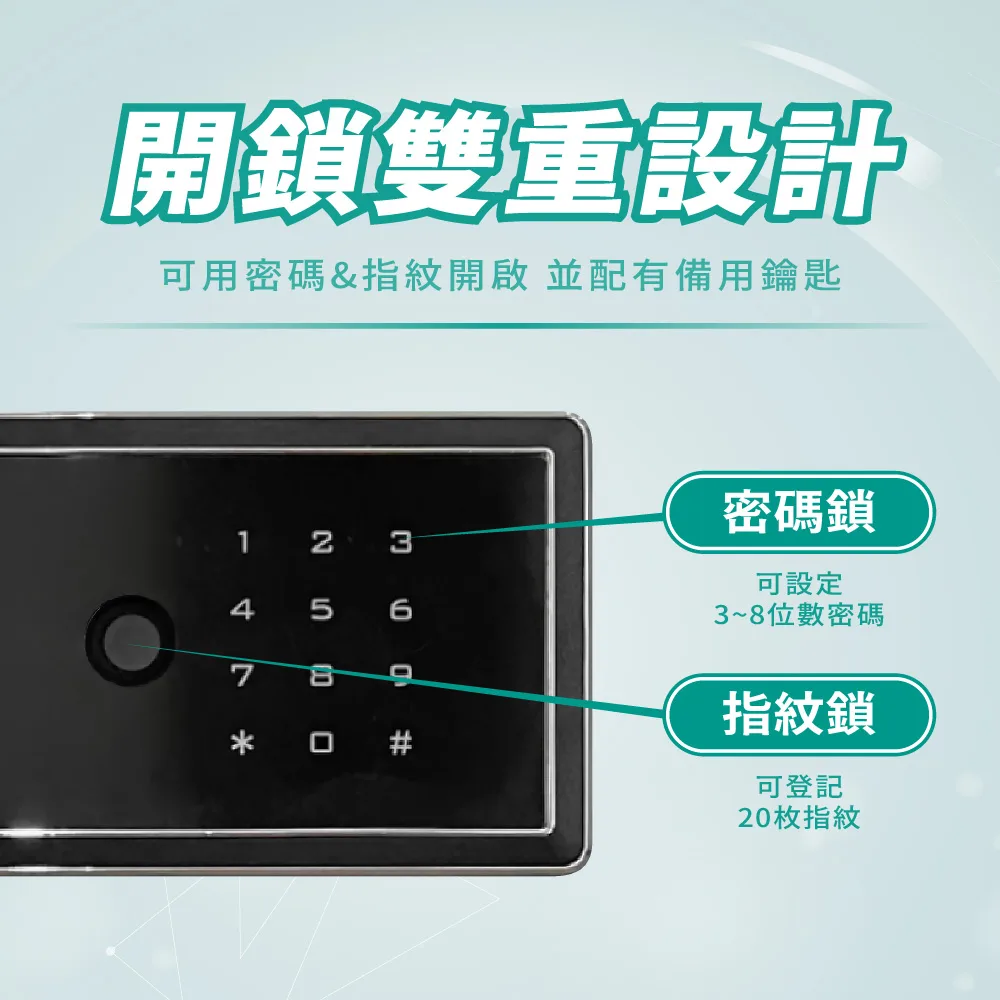 1.三種鎖定系統安全性高。 2.觸控面板、指紋面板 3.帶層架/抽屜 4.語音提示,操作簡單 5.指紋最多可設置20組