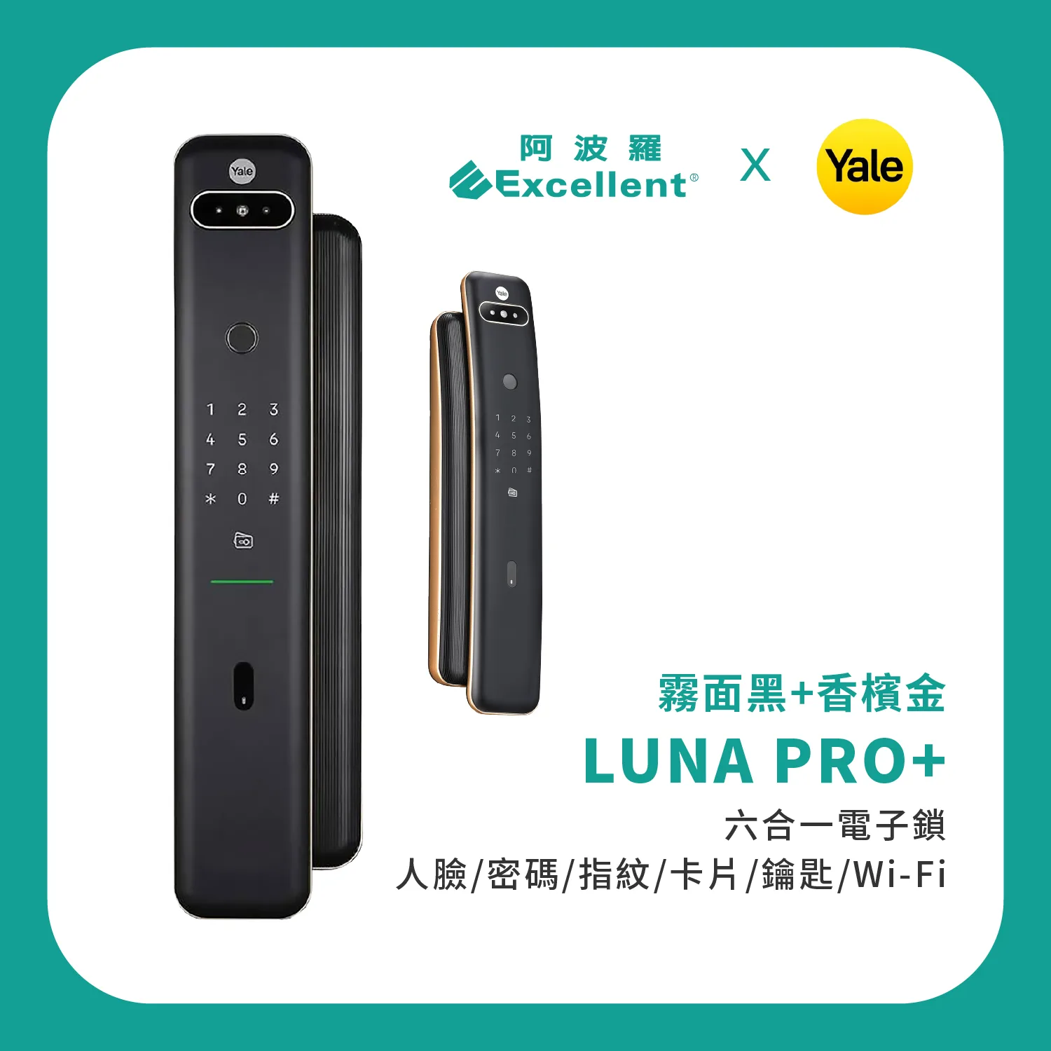 【Yale耶魯】Luna Pro+ 6合1智能鎖_3D人臉辨識推拉智能鎖/電子鎖-香檳金(指紋│卡片│密碼│藍芽│Wifi│鑰匙)